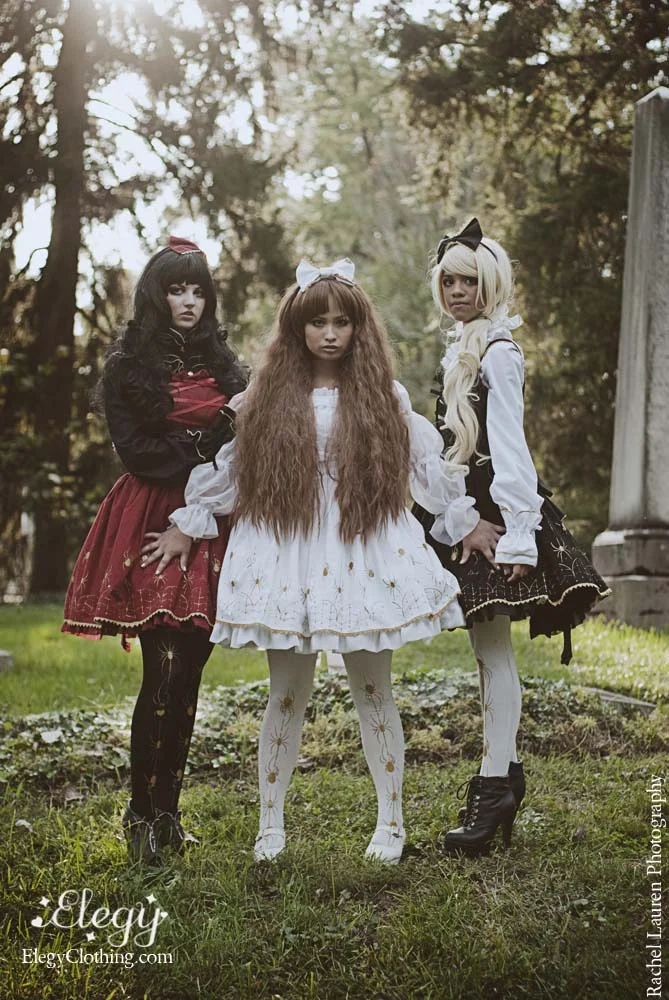 Resplendent Nightmare is my first Gothic print, released for Halloween 2012. It was also the first and only screen printed design I've done - the dresses and tights were all hand printed by me.